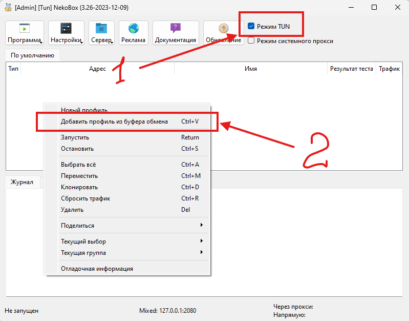 Сразу ставим галку сверху справа «Режим TUN», скорее всего, клиент перезапустится.
