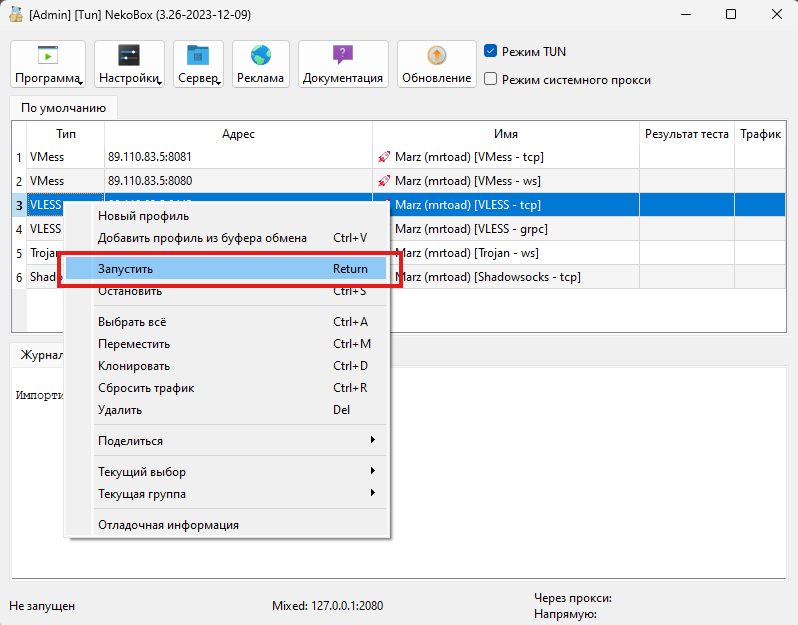 После того как закончили добавлять подписки, щелкаете по нужной (любой) правой клавишей и выбираете «Запустить» (Когда надо будет отключить ВПН, выбираете «Отключить»)